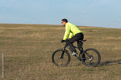 Cyclist in pants and green jacket on a modern carbon hardtail bike with an air suspension fork. The guy on the top of the hill rides a bike.