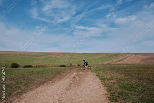 Cyclist on a gravel road across a vast, idyllic landscape under a vibrant blue sky. Perfect for travel, adventure, and sports themes.