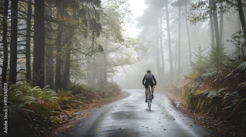 Cyclist riding in the early morning mist in a forest