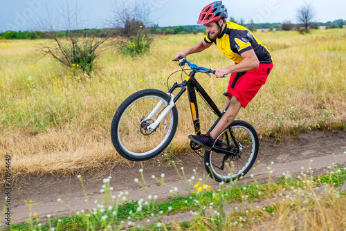 Cyclist riding on the rear wheel of the bicycle, active lifestyle.