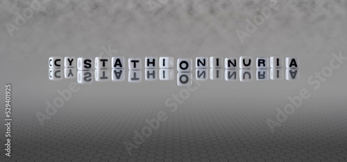 cystathioninuria word or concept represented by black and white letter cubes on a grey horizon background stretching to infinity