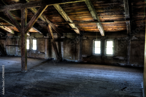 loft, room, formwork, ground, beam, renewal, restoration, dormer, living room, window, casement, window sill, architecture, house, building, ruin, wall, leaves, view, mystic, dark, lonely, home, expired