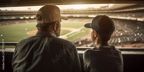 dad and son watching a game sports match on the stands of the stadium together. Generative AI