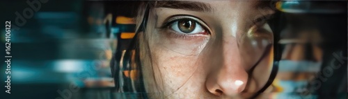 Daily burnout with disconnected mind concept. Close-up of a person's eye with a digital effect background.