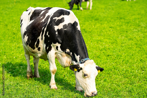 Dairy cow farming. Mammals grazing in the grass. Cow on a ranch. Pasture filled with cows and calves. Bovine cow in the countryside. Field of grazing livestock. Grazing cows.