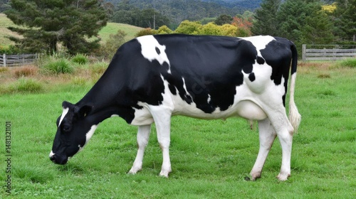 Dairy Cow Grazing in Lush Green Pasture with Rolling Hills