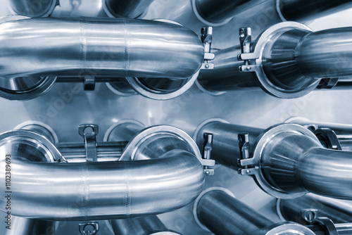 Dairy machine cooling radiator with a row of stainless steel metal pipes with silver trim. The pipes are connected to each other and appear to be part of a larger system