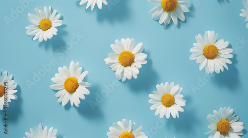 Daisy pattern Flat lay spring and summer chamomile flowers on a blue background Repetition concept Top view : Generative AI