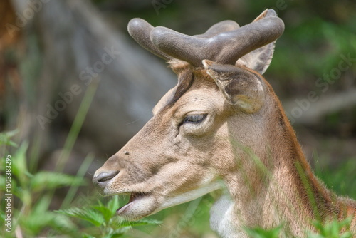 Dama dama aka European fallow deer male close-up head portrait.