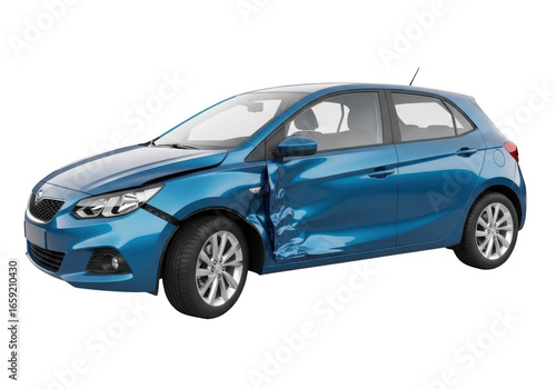 vehicle, automobile, transportation, accident, damage, wreck, collision, metal, insurance, repair, auto, hatchback, blue, car, broken, front, side, wheel, tire, headlamp, bumper, door, fender, road, street, urban, modern, style, transparent, background