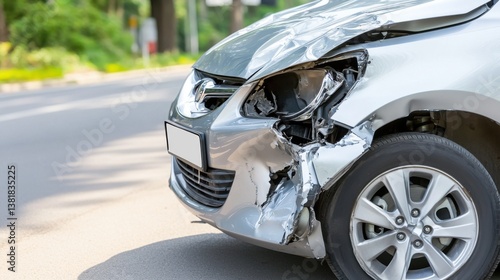 Damaged silver car with smashed front, headlight broken and bumper destroyed.