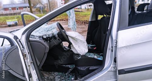 Damaged wrecked car after serious car crash in traffic