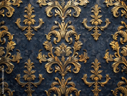 Damask pattern, gold accents, luxurious, elegant, vintage style.