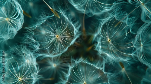 Dandelion seeds in abstract macro view, floating against a dark green background, soft and intricate textures, surreal feel