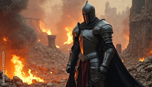 Dark armored medieval knight amid fiery destruction of war ruins. Heroic warrior stands amidst flames, battles raging. Fantasy artwork evokes courage, strength in dark, epic, dramatic scene.