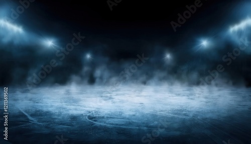 dark atmospheric ice rink illuminated by hazy bright spotlights with a foggy frozen surface, ideal for sports or dramatic backdrops