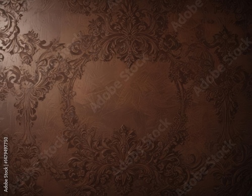 Dark brown ornate wallpaper, peeling layers reveal underlying color, distressed appearance , dark, wallpaper, brown