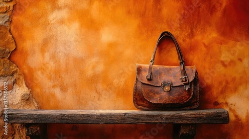 Dark brown vintage leather shoulder bag against a rustic orange background