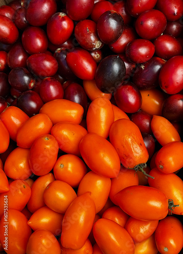 Dark burgundy and red tomatoes. Mix of multi-colored tomatoes on a summer day. Top view.