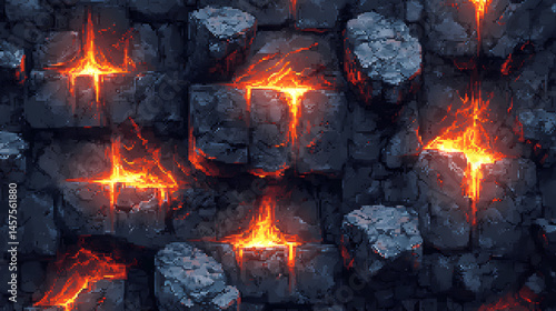 Dark cave game background stone walls firelight. [Neon Fables] | Pixel Beasts | blocky monster. Illustration
