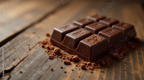 Dark Chocolate Bar Resting on Cocoa Powder Scattered Across Rustic Wooden Surface