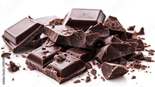 Dark Chocolate Pieces on White Background with Crushed Fragments