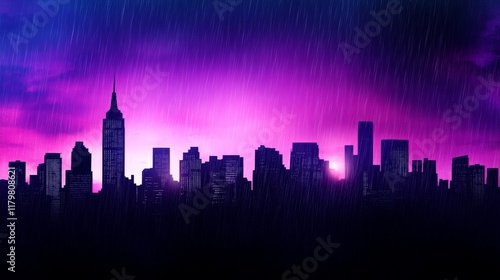 city landscape, city, urban, rain, storm, night, dark, purple, silhouette, building, skyscraper, gothic, dramatic, atmosphere, mood, mystery, evening, twilight, dusk, sunset, sky, cloud, raindrop, wet, slick, modern, architecture, design, illustration, artwork, graphic, background, wallpaper, texture, abstract, art, image, visual, scene, view, perspective, composition, light, shadow, contrast, colours, tone, style