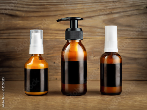 Dark cosmetic amber glass bottles set with black blank labels for cosmetics on a wooden background.