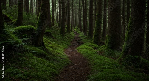 Dark Forest Path with Lush Green Moss