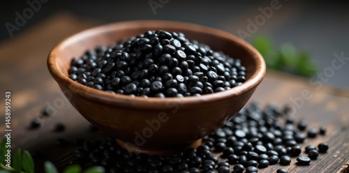 Dark, glistening black sesame seeds fill a rustic bowl , background, macro