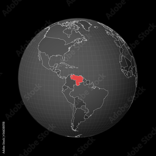 Dark globe centered to Venezuela. Country highlighted with red color on world map. Satellite world projection. Modern vector illustration.