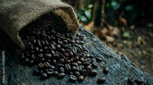 hot drink, bean, roasted, dark, glossy, burlap, sack, dramatic, shot, spill, wooden, surface, natural, background, closeup, texture, rich, aroma, favor, earthy, caffeine, beverage, epicure, organic, fresh, harvest, nature, brown, agricultural, crop, growth, raw, blend, culinary, ingredient, preparation, cafes, brewing, espresso, filter, collection, whole, environmentally friendly, sustainable, decor
