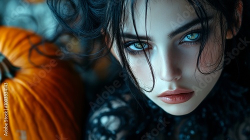 Dark Gothic Halloween Aesthetic with Pumpkins and Mysterious Girl