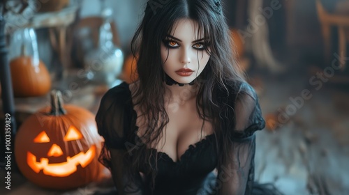 Dark Gothic Halloween Aesthetic with Pumpkins and Mysterious Girl