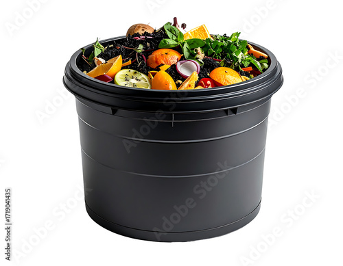 compost, bin, container, grey, dark, cylindrical, fruit, vegetable, scrap, herb, tea, leaf, orange, citrous, peel, kiwi, onion, tomatoes, basil, food, waste, recycling, organic, garden, kitchen, eco, sustainable, environment, natural, healthy, biodegradable, decomposition, earth, dirtied, growth, plant, produce, vibrant, colourful, full, overflowing, round, lid, rim, black, bucket, composting, matter