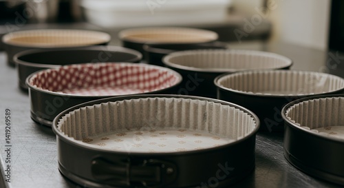 promotion, step, receipe, book, cook, food, prepare, cake, pan, baking, pastry, cooking, preparation, culinary, kitchen, round, metal, parchment, paper, gingham, supply, dessert, sweet, grey, background, dark, surface, close, up, overhead, shot, photo, bakery, tool, liner, pan, art, domestic, home, process, still, life, high, angle, view, detail, macro, texture, pattern