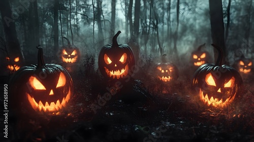 Dark Halloween forest scene with scary pumpkin heads looming in the shadows