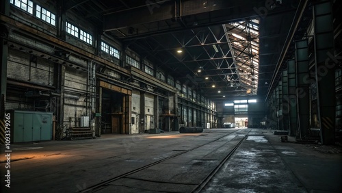 Dark industrial factory floor with exposed machinery, gritty textures, abandoned equipment, grunge industrial background, metal beams, dim lighting
