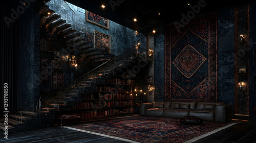 library, dark, interior, stair, book, rug, stone, gothic, vintage, mysterious, home, room, house, design, architecture, old, antique, reading, study, cosy, relax, luxury, elegant, sophisticated, comfortable, atmosphere, mood, shadow, light, texture, wall, floor, furniture, carpet, illumination, interior design, residential, space, style, classic, grand, tapestry, candle, wealth