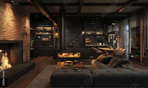 interior, modern, furniture, design, room, home, window, luxury, sofa, floor, indoor, apartment, living, fireplace, nobody, decor, contemporary, house, wall, architecture, couch, wood, table, carpet, light, dark, loft, industrial, style