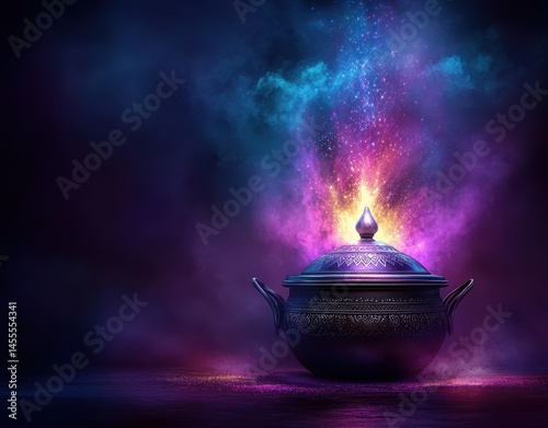 mystical, magical, pot, dark, colourful, light, swirling, glowing, ancient, decorative, metallic, spiritual, energy, aura, container, fire, infuriated, cloud, smoke, vapour, illusion, fantasy, silver, purple, blue, pink, orange, red, gold, lighting, effect, dramatic, still, life, studio, image, art, design, texture, shadow, surface, object, background, mystery