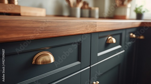 kitchen, cabinetry, dark, blue, wood, countertop, cabinet, drawer, handle, bronze, brass, furniture, design, interior, modern, home, decor, style, detail, warm, brown, elegant, contemporary, compact, organised, storage, functional, smooth, finish, light, contrast, texture, practical, homeowner, apartment, stylish, decorating, beautiful, kitchen utensile, utensil