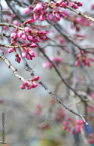 Dark pink cherry blossom buds waiting to open for the season in Maruyama Park in Kyoto, Japan