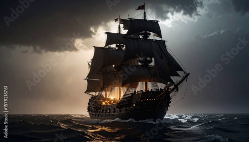 Dark Pirate Ship Sailing in Rough Ocean Under Stormy Sky