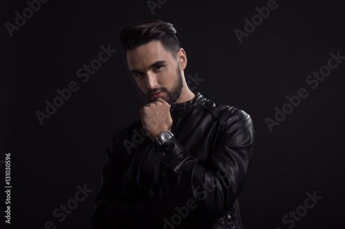 20s, black background, caucasian, adult, black hair, casual clothes, dark, photogenic, leather jacket, man, model, 1, portrait, young
