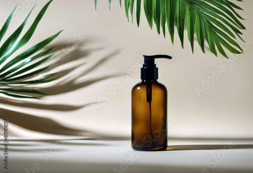 bottle, container, cosmetic, beige, dark, amber, goggles, background, white, table, lotion, serum, oil, cream, essential, presentation, shadow, palm, leaf, environmentally friendly, recyclable, nature, wellness, spa, beauty, natural, healthy, care, product, concept, lifestyle, organic, health, skin, beautiful, composition, abstract, dais, advertisement, tropical, empty, light, wall, design, show, glasses, medicine, isolated, brown