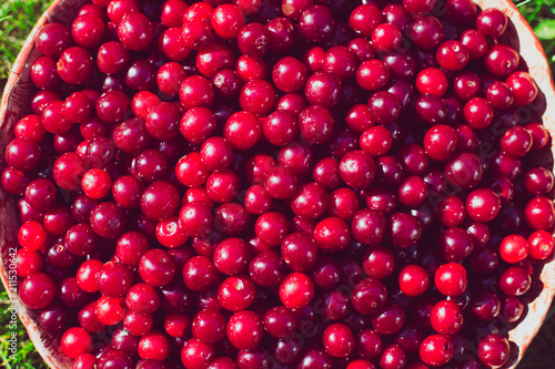 Dark red cherry in bowl in. green grass. Harvest of natural berries. Organic food.