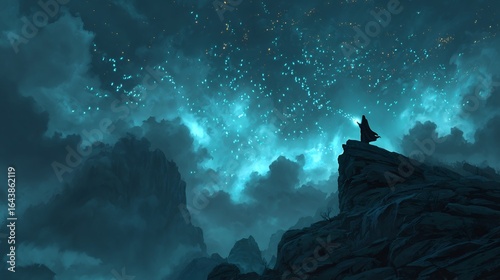 dark, sorcerer, standing, atop, jagged, cliff, storm, glowing, black, beetle, blot, out, star, digital, art, style, illustration, painting, brushstroke, detailed, drawing, expressionism, hand-drawn, artwork, textured, surreal, artistic, creative, vibrant, graphic, portrait, abstract, fantasy, landscape, colourful, vignetting, design, storytelling, canvas