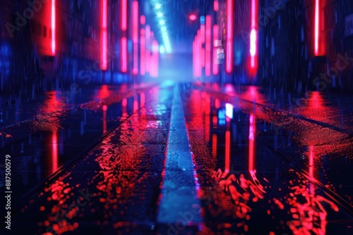 Dark street, reflection of neon light on wet asphalt. Rays of light and red laser light in the dark. Night view of the street