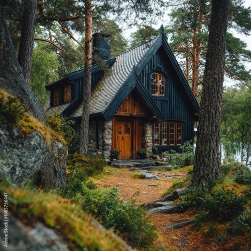 cabin, forest, wood, dark, stone, autumn, nature, path, house, cosy, misty, lake, tree, mountain, rustic, charming, peaceful, quiet, hidden, isolated, wooden, exterior, scenery, architecture, landscape, brown, green, grey, moss, rock, stone, pathway, entrance, door, window, idylli, secluded, fall, home